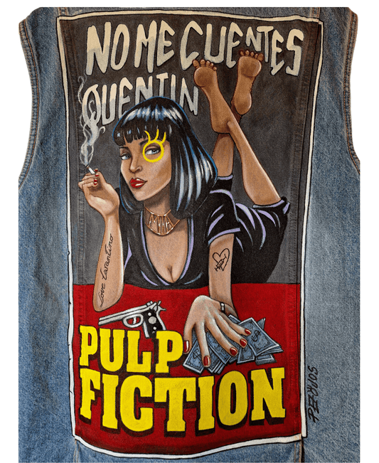 Chaleco largo vaquero pintado a mano – Estilo Pezojos, inspirado en Pulp Fiction