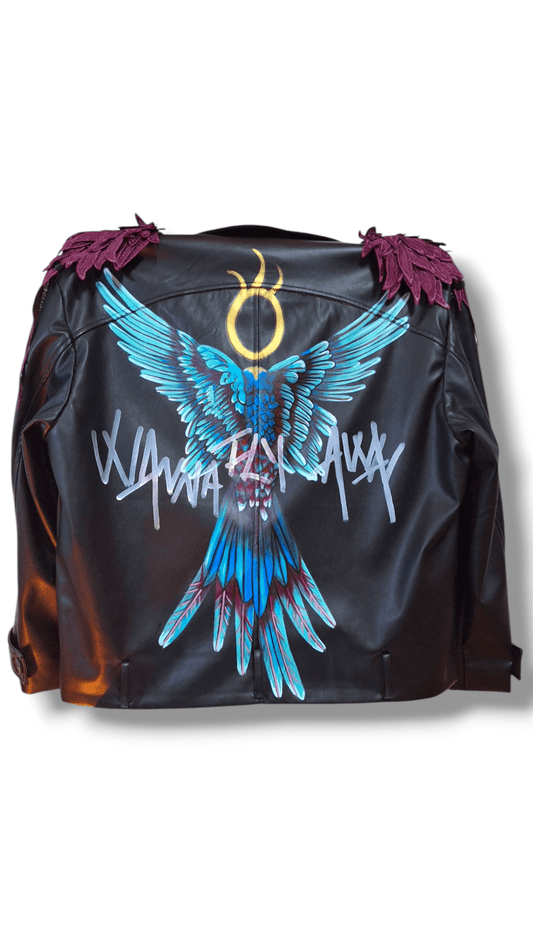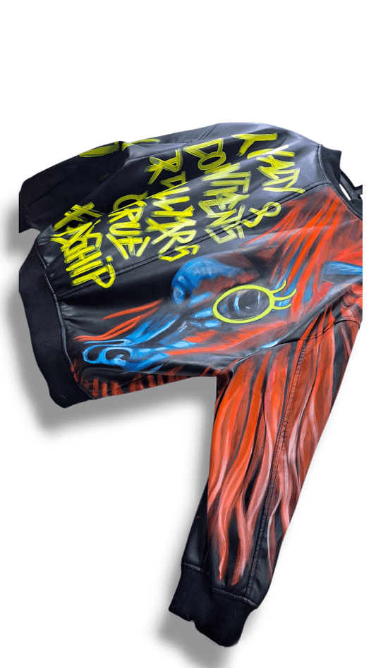 Chaqueta bomber de polipiel pintada a mano – Diseño exclusivo de caballo en azul y naranja