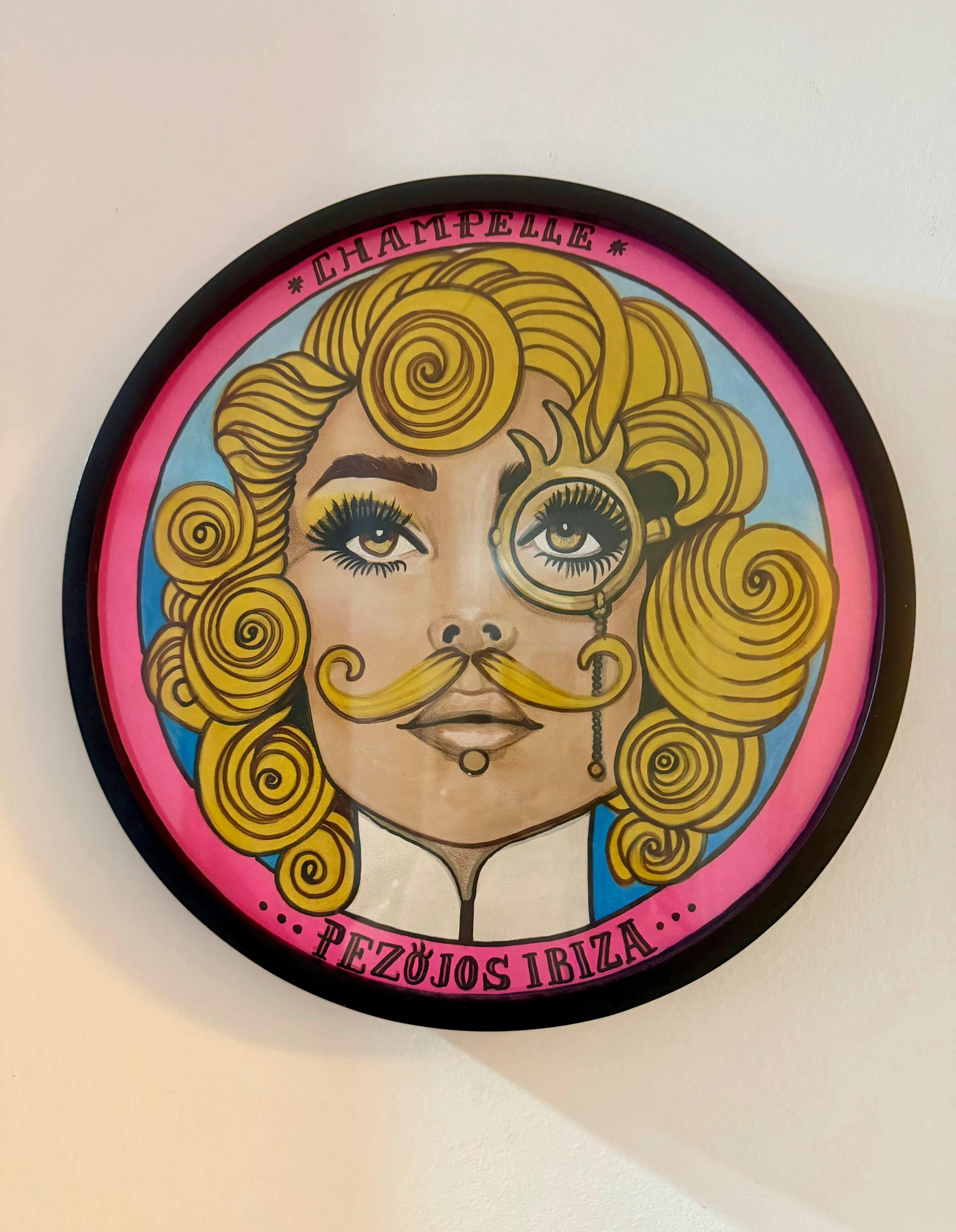 Un autorretrato de Andrea Popnaïf en estilo victoriano. Su cabello rubio rizado forma bucles elegantes, y un monóculo dorado con tres pestañas adorna uno de sus ojos. Destaca un bigote rubio, un piercing de perla dorada debajo del labio y cuellos altos, todo enmarcado por un círculo rosa sobre un fondo azul.